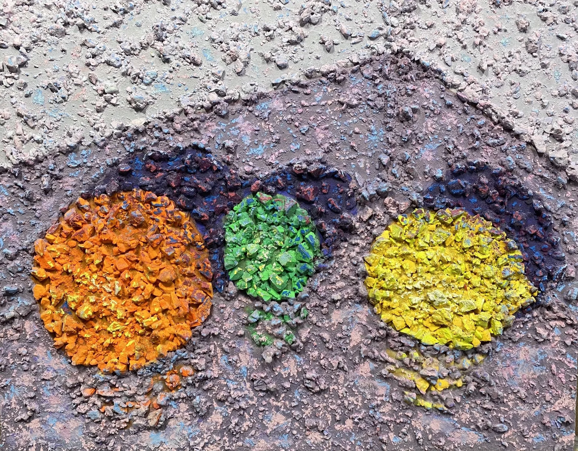 This pastel was made by mixing pastel dust of a given color with clear gesso, applied thickly in a line or shape on a pasteboard surface, then pieces of the same color pastel were stuck to the colored gesso. Afterwards, the chards were sealed and then varnished
